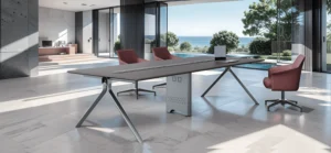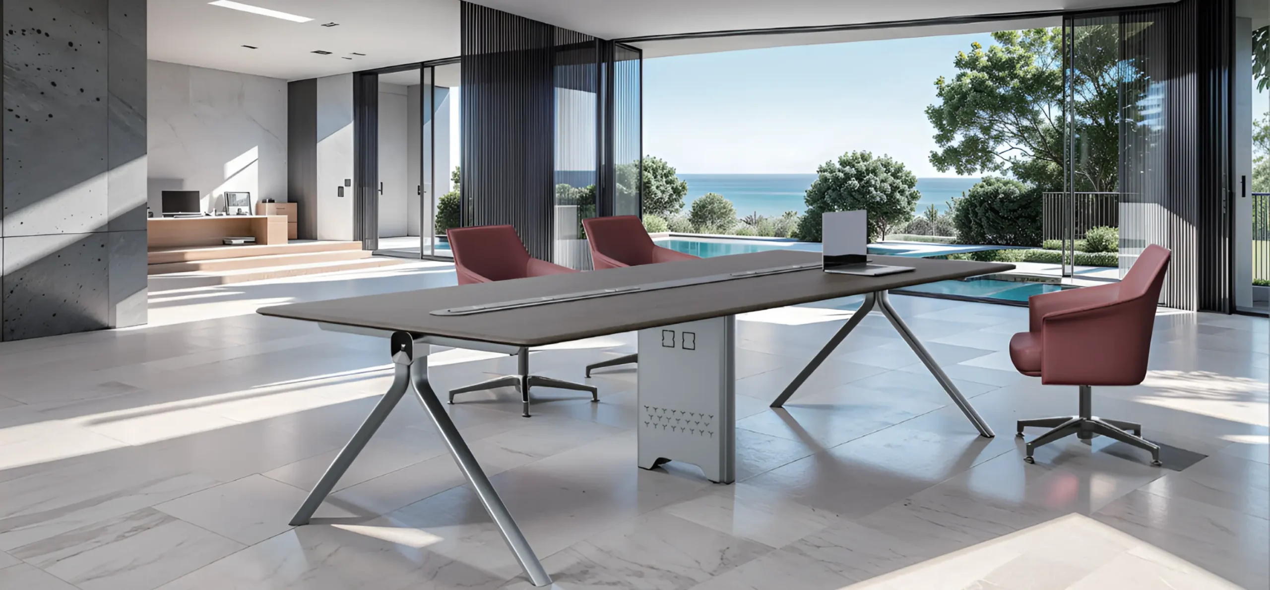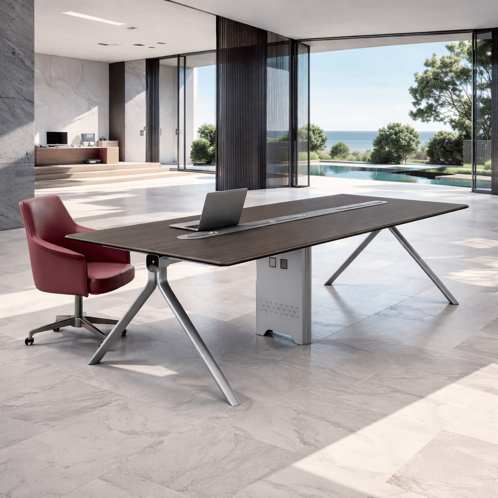 A premium executive conference table crafted with modern elegance, featuring seamless cable integration and a spacious, refined work surface. Designed to enhance productivity, it creates a sophisticated professional environment with an open, airy layout inspired by scenic outdoor views.