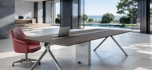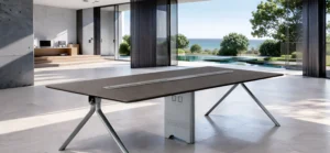 Set within a beautifully designed interior that overlooks lush greenery and a serene ocean backdrop, the table exudes a sense of openness and prestige. The design blends practicality with luxury—making it ideal for leadership meetings, strategy discussions, client presentations, and collaborative teamwork. Paired with premium leather conference chairs, the overall ambiance creates an inspiring workplace that reflects excellence and modern sophistication.