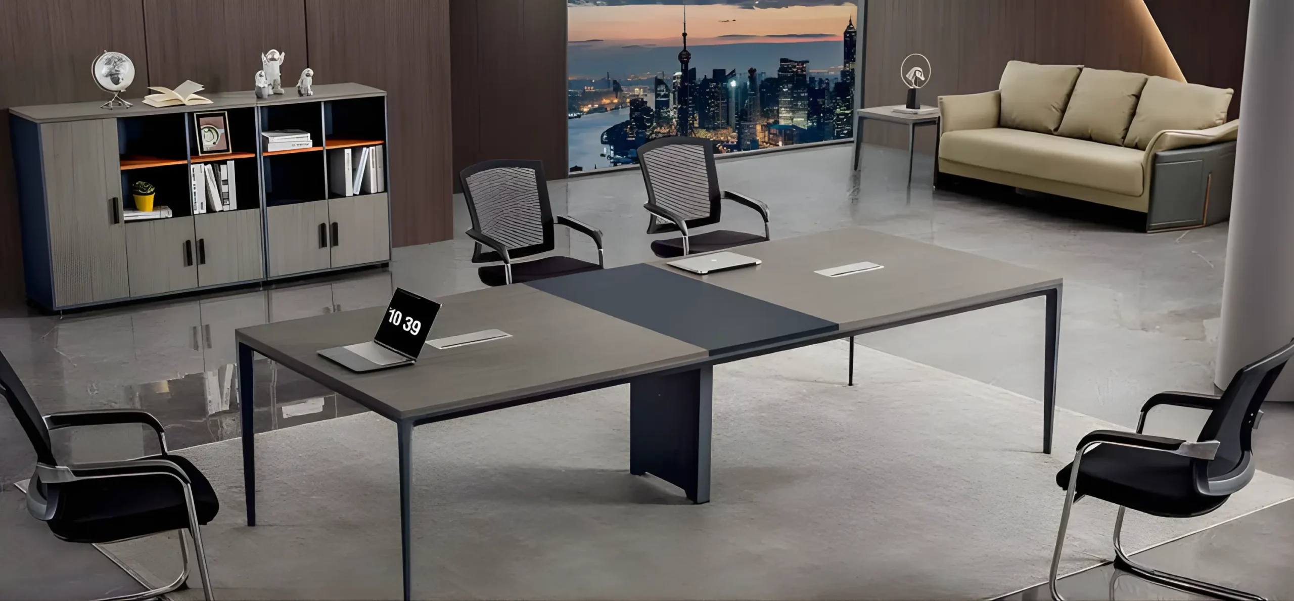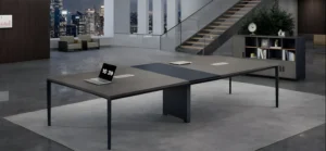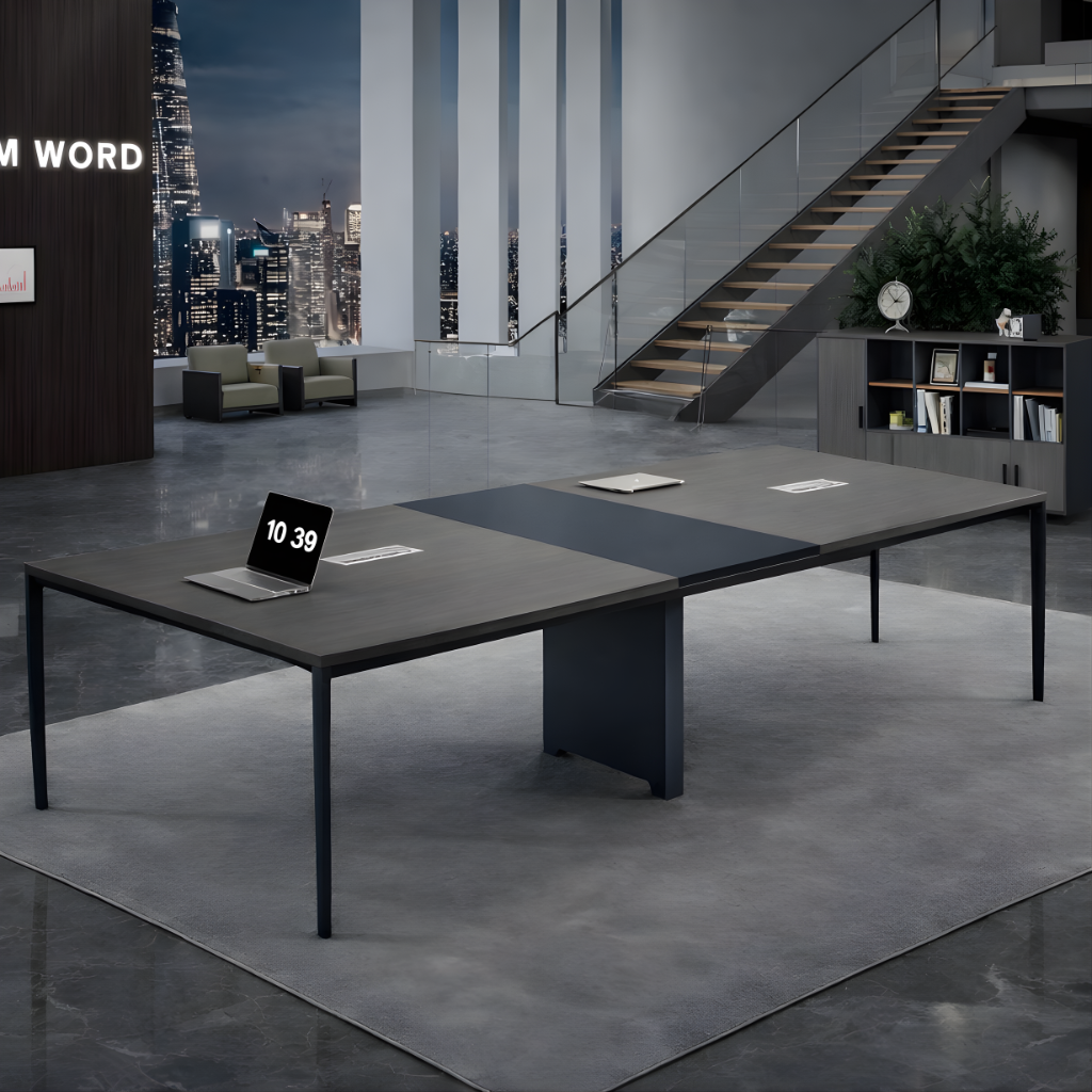 This modern conference table offers a spacious, durable, and contemporary workspace ideal for meetings and teamwork. Its sleek design, strong metal legs, and premium wooden surface ensure stability and style, making it perfect for offices that value functionality, aesthetics, and professional appeal.