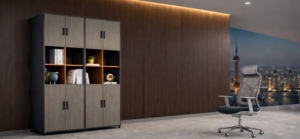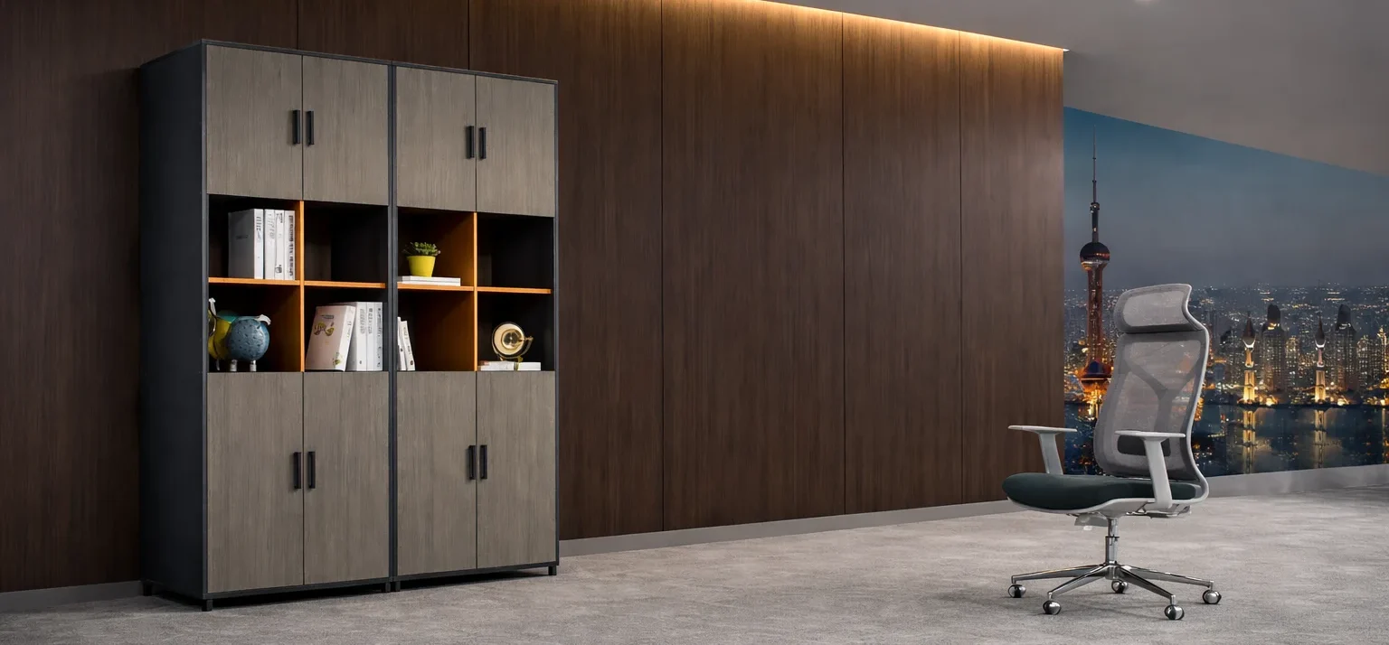 This contemporary office bookcase is thoughtfully designed to balance functionality and visual appeal. Featuring a sturdy structure with a two-tone wood finish, it includes closed cabinets for concealed storage and open shelves for displaying books, décor, or awards. The clean lines and neutral tones blend seamlessly with modern office interiors, creating an organized and polished workspace. Ideal for executive cabins, corporate offices, and meeting rooms, this storage unit enhances efficiency while maintaining a professional, sophisticated presence.