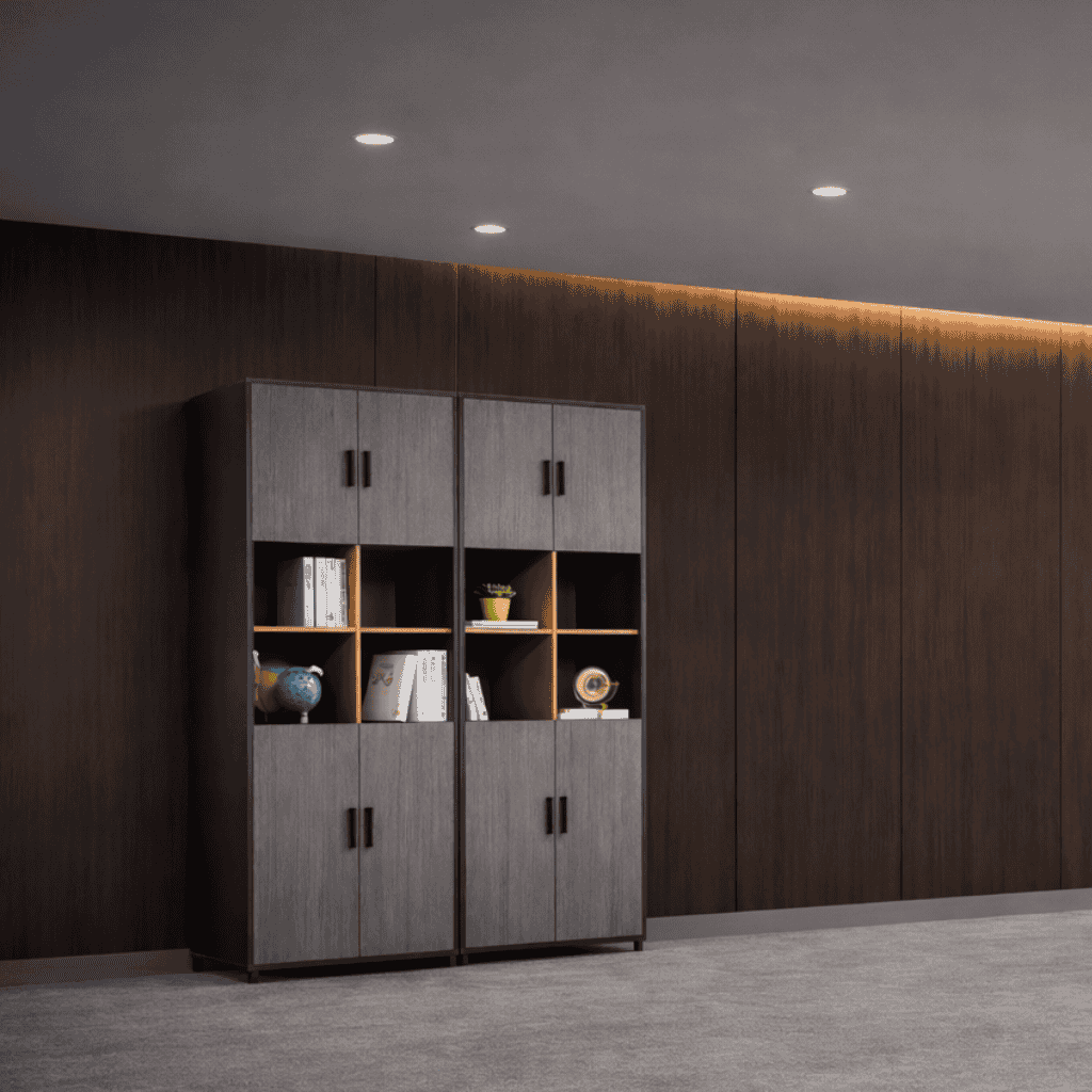 This modern office bookcase combines closed storage and open display shelves in a refined two-tone finish. Designed for organized workspaces, it offers practical storage while enhancing interiors with a clean, contemporary look ideal for executive offices and professional environments.