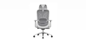 Mesh back with adjustable lumbar and headrest for posture support.