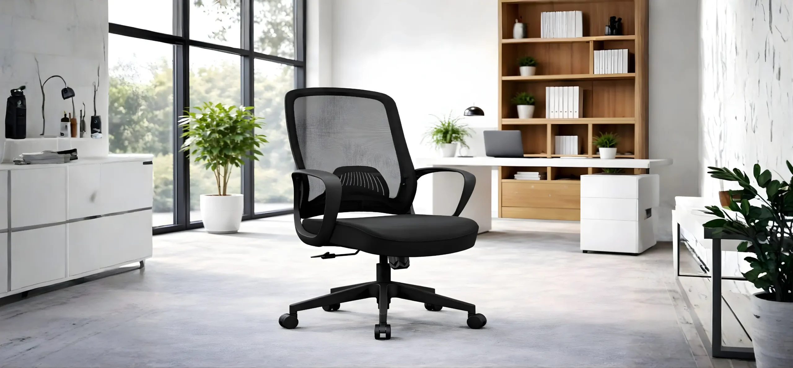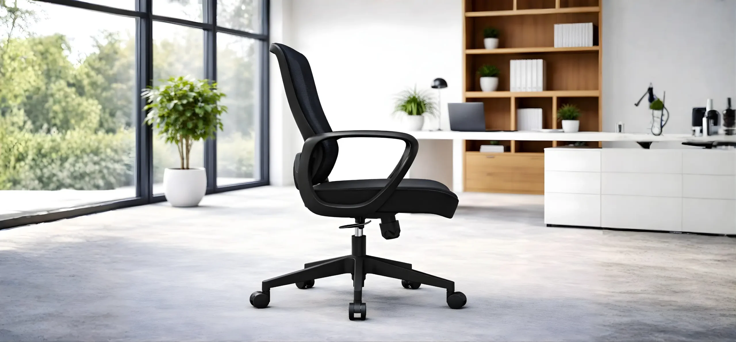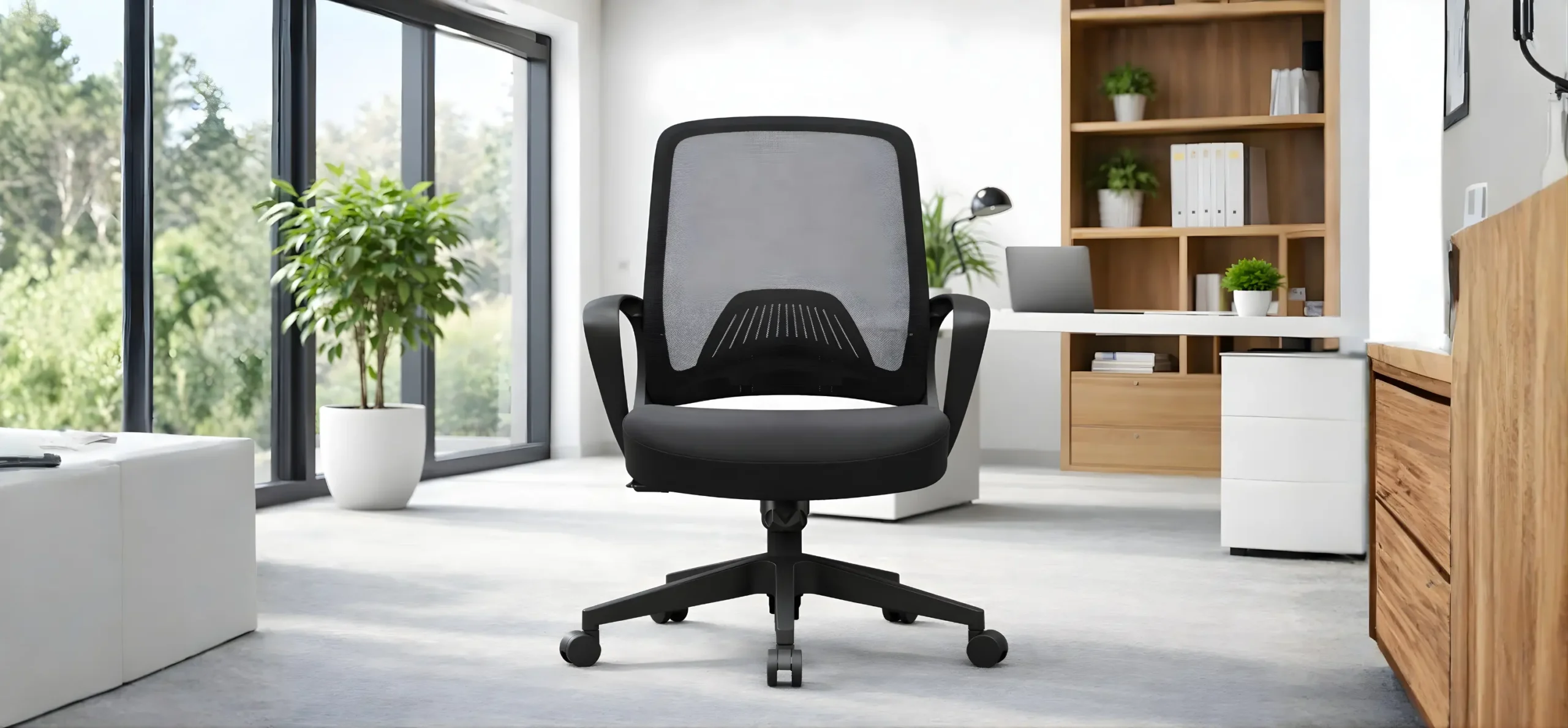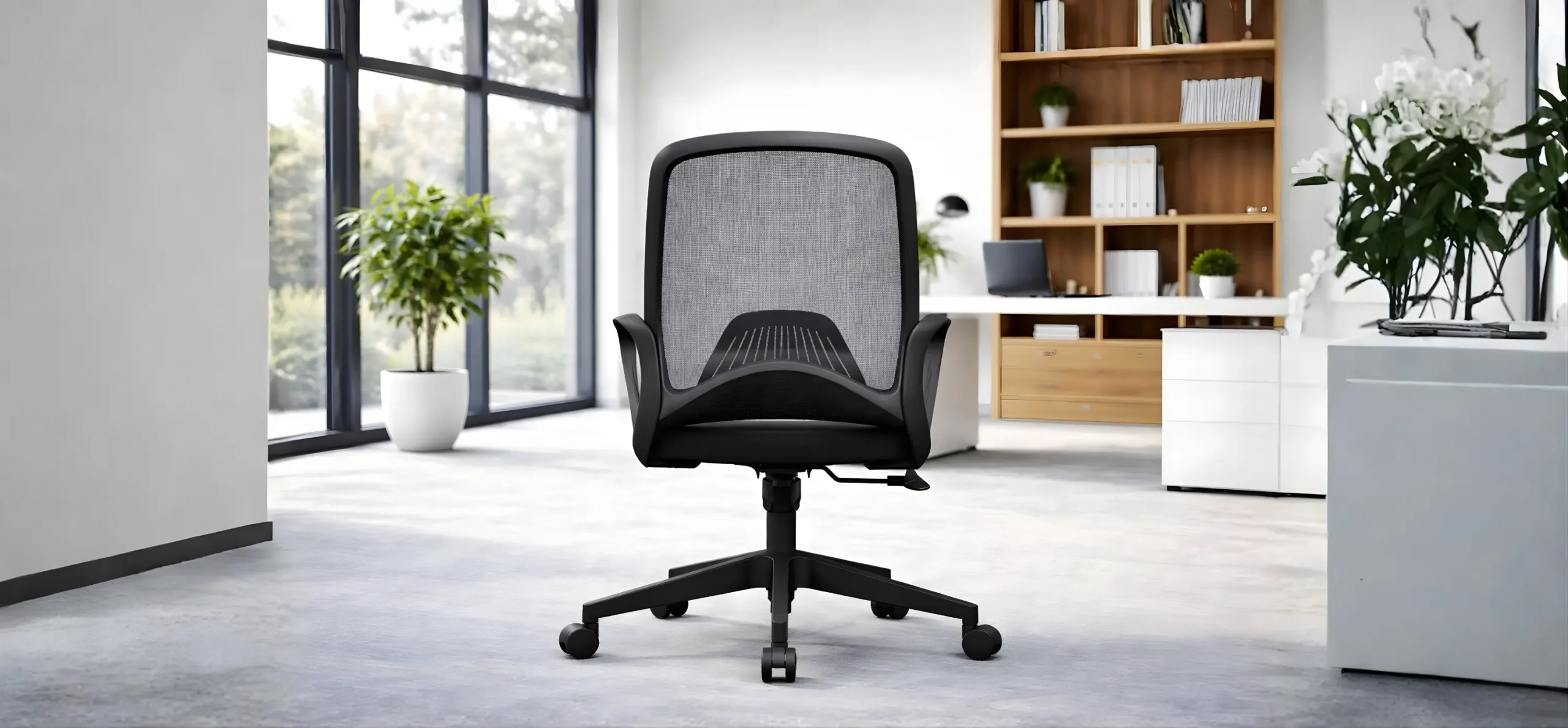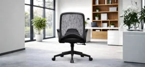 Medium back office swivel chair designed for everyday office use, featuring a mesh back with fiberglass frame and PP adjusted lumbar support for basic ergonomic comfort. Comes with PP fixed armrests and a high-density molded foam seat cushion with 12mm thickness slab. Equipped with a lockable tilting mechanism, smooth gas lift, durable 320mm five-star PP base supporting up to 1000 kg, and 50mm PU castors with BIFMA standard.