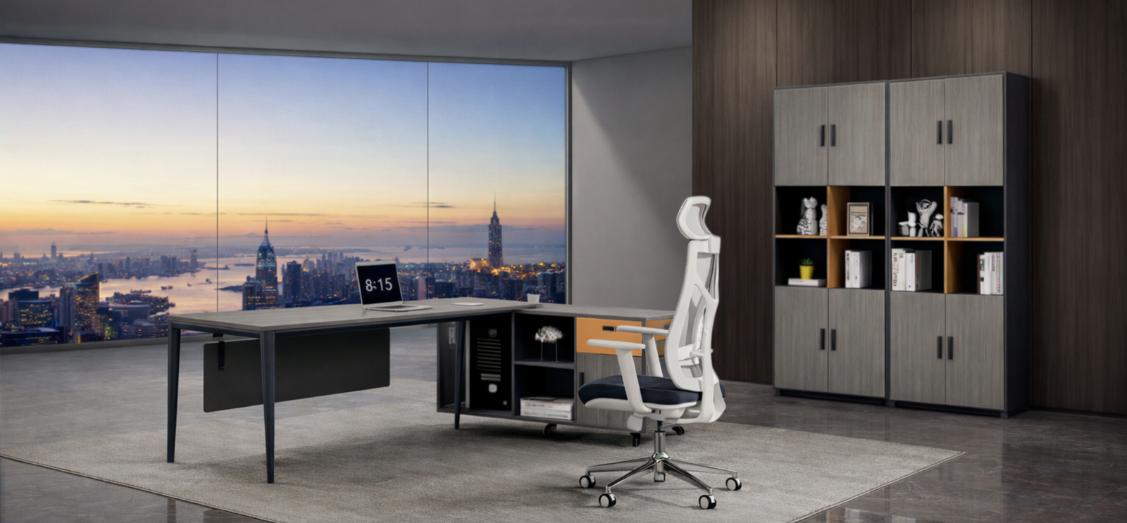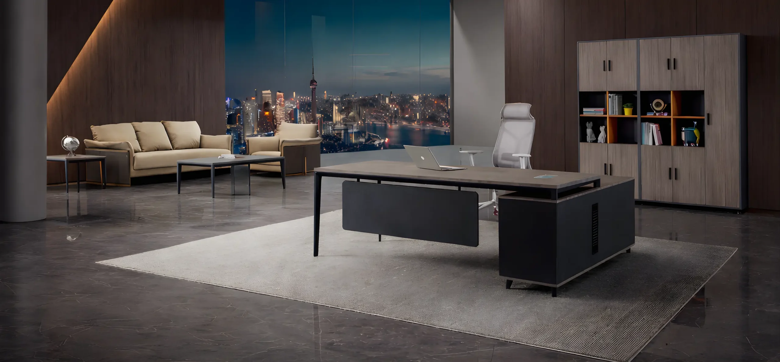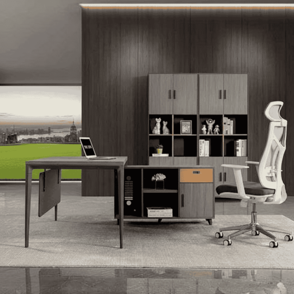 This contemporary executive desk is thoughtfully designed to elevate modern office spaces with style and functionality. Featuring a spacious tabletop, integrated storage compartments, and a sleek modular cabinet, it offers both organization and visual balance. The ergonomic chair complements long working hours, while the neutral color palette blends seamlessly with professional interiors. Clean architectural lines and premium finishes create a refined workspace that supports focus, efficiency, and comfort. Ideal for executive cabins, corporate offices, and managerial spaces, this setup reflects modern professionalism while maintaining practicality, durability, and a timeless aesthetic suited for evolving workplace environments.